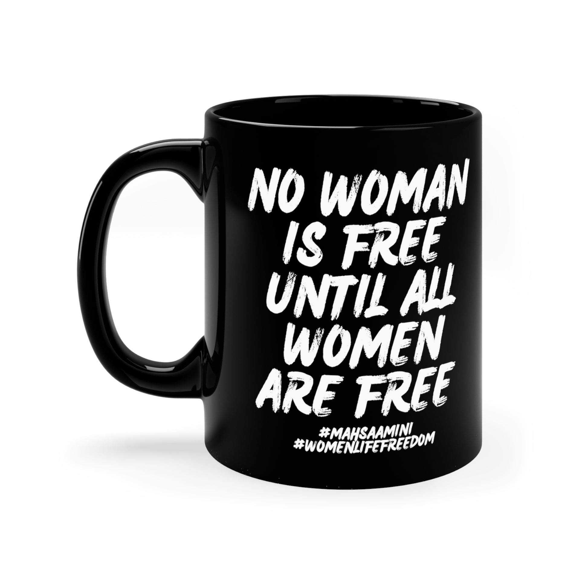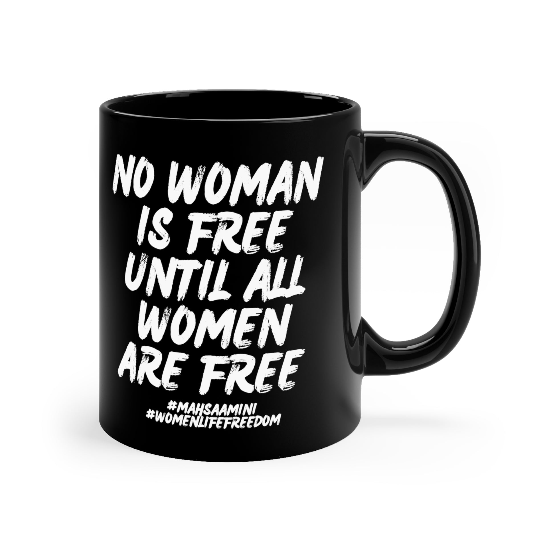 Warm your soul with a nice cup of the beverage of your choice with this perfectly sized black ceramic mug. Customized with No woman is free until all women are free. It’s BPA and lead-free, microwave and dishwasher-safe, and made of black durable ceramic in 11-ounce sizes. The high-quality sublimation printing makes this black ceramic mug the perfect gift for your true coffee, tea, or hot chocolate lover.
