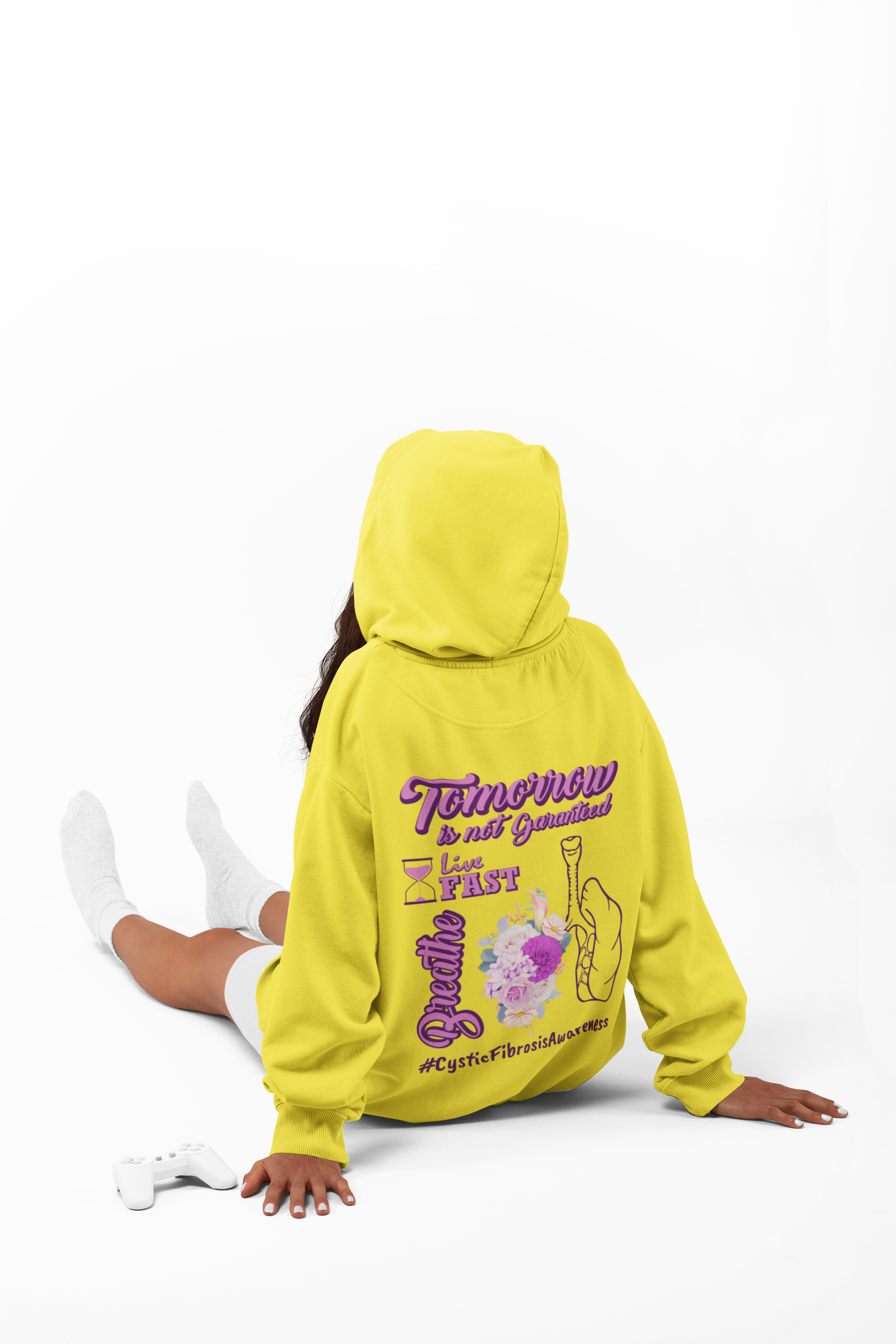 This premium kick ass Cystic Fibrosis Cure CF Breathe hoodie has been called the softest hoodie ever made. Sure to put a smile on your face when you put it on. This unisex pullover is a classic and probably one of the most softest hoodies you’ll own. It’s created and spun with plush fabric that is made up of cotton and polyester fibers. Has a slight V neckline for comfort, an ideal hoodie for keeping you warm. It’s got a floral lined hood with a beautiful floral design and Breathe in the front. A large CF design on the back and on top of it it’s yellow. So you’ll look amazing on wear yellow day!! BONUS