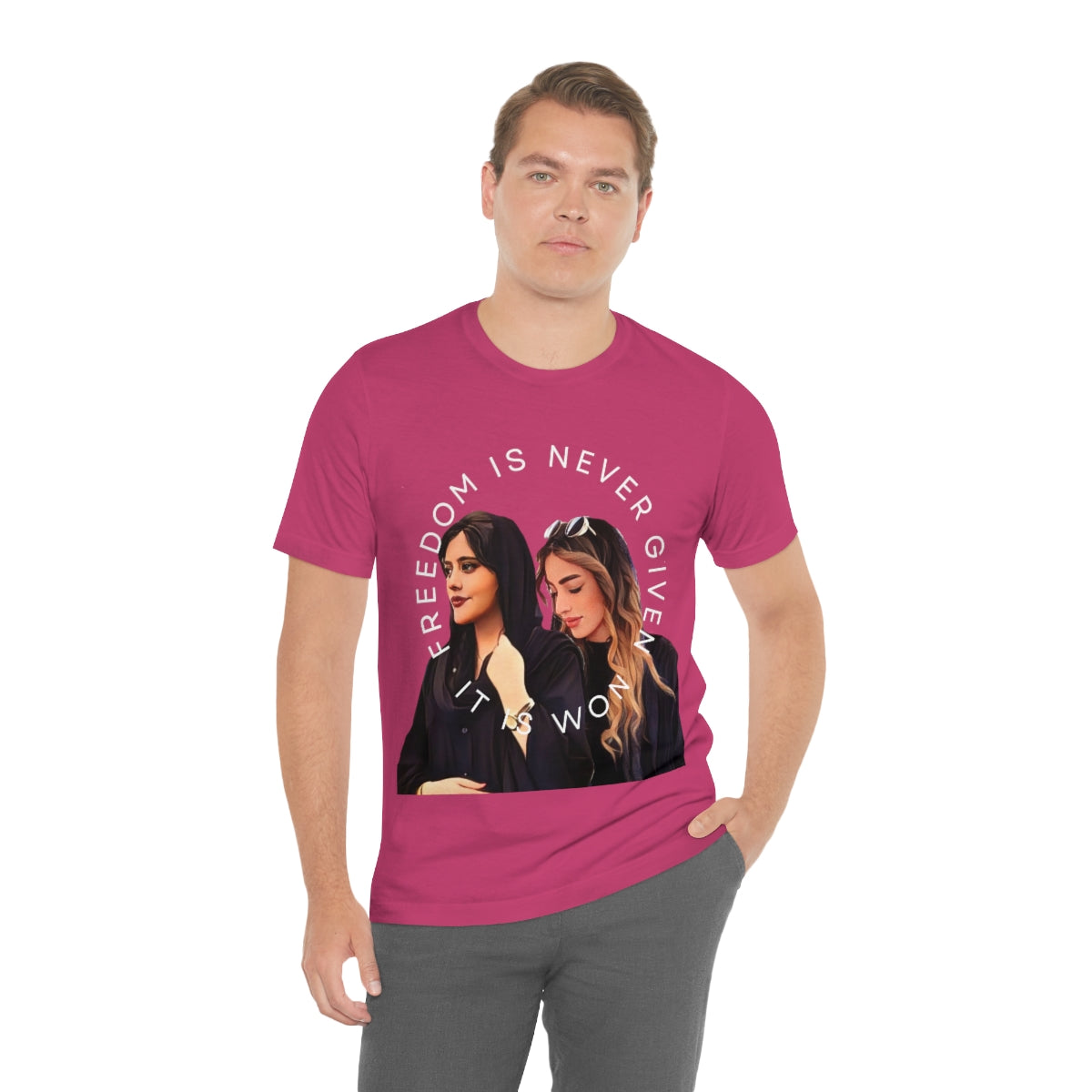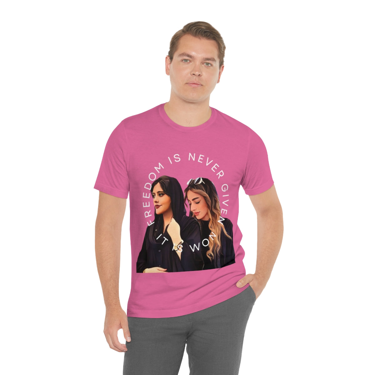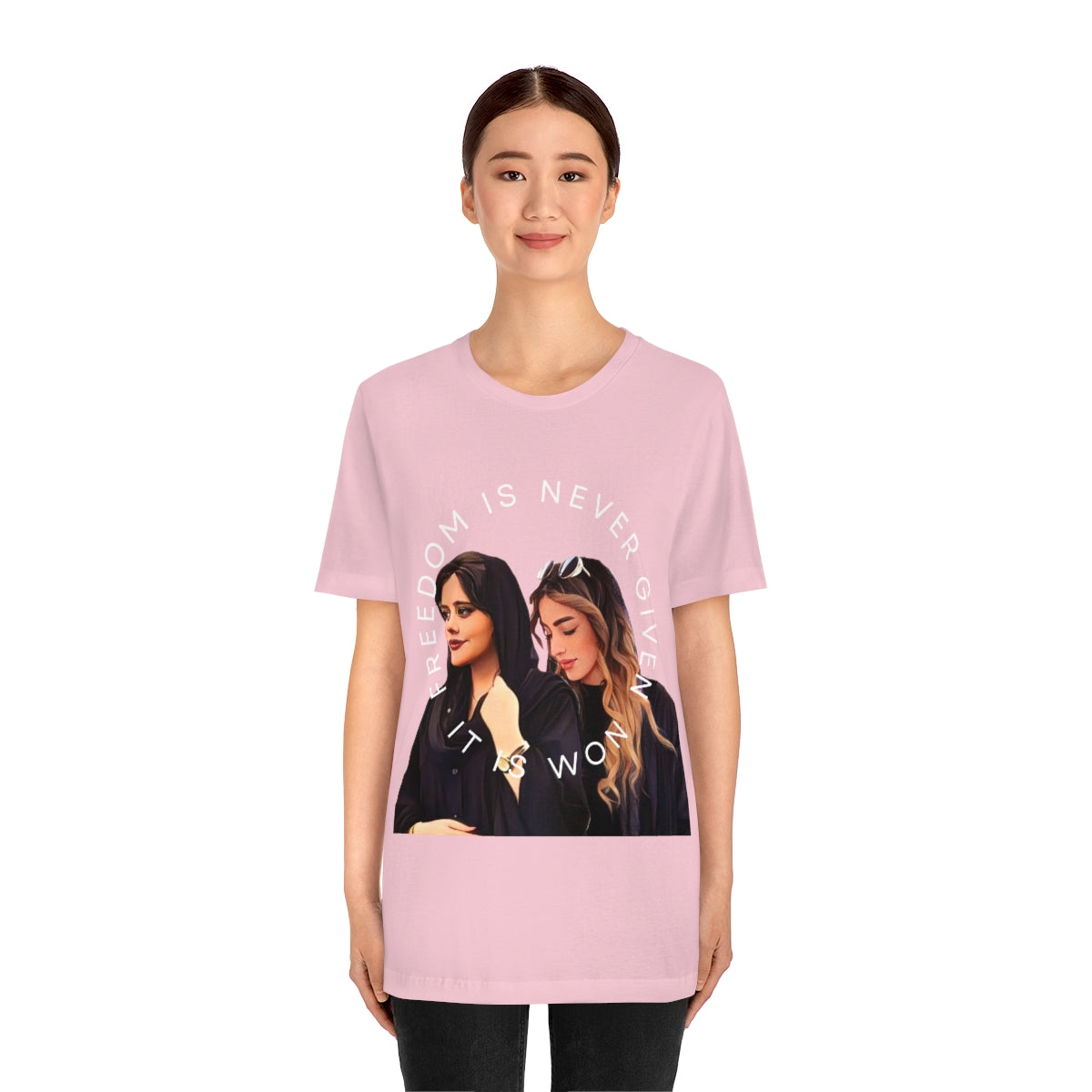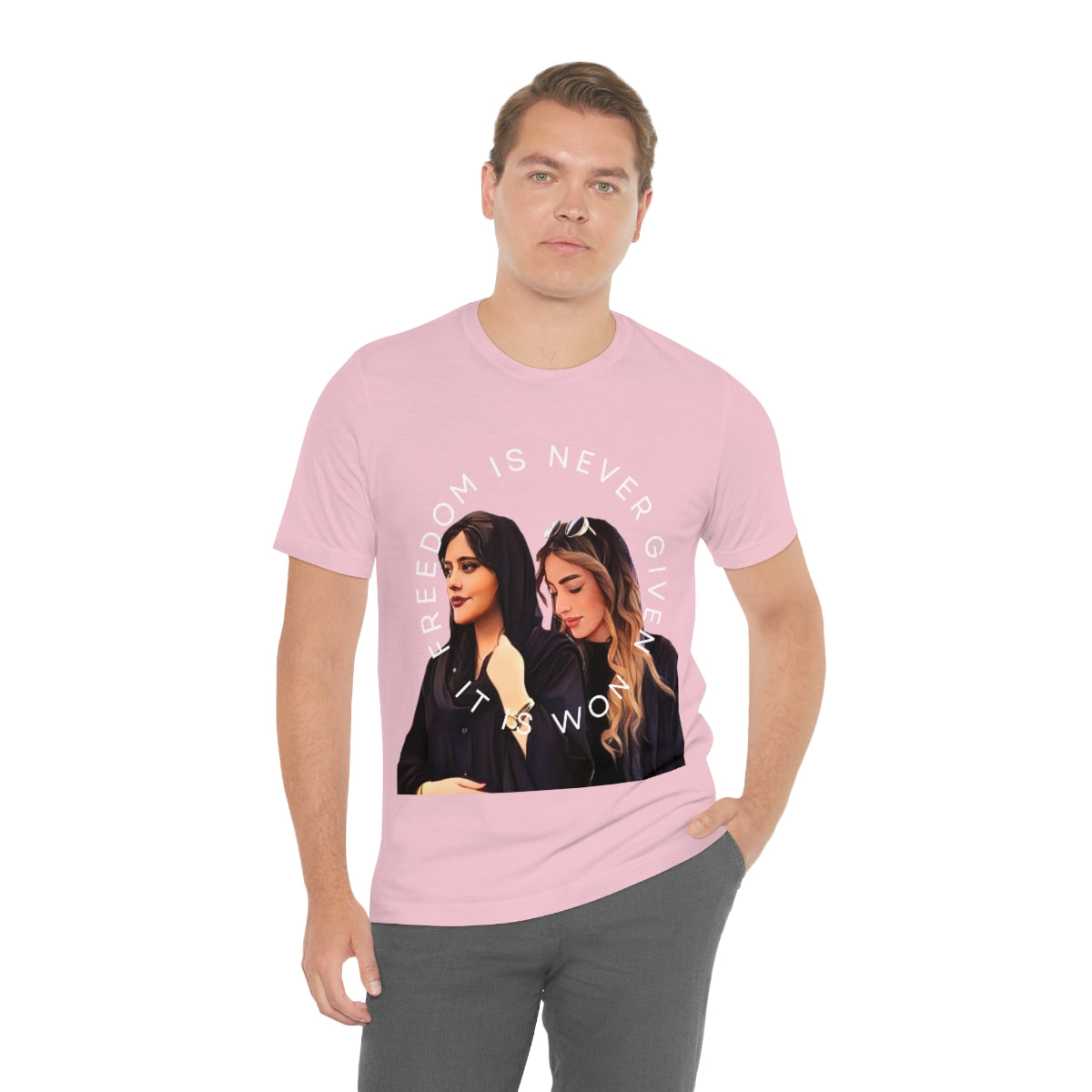 This classic unisex jersey short sleeve tee fits like a well-loved favorite. Soft cotton and quality print make you fall in love with it over and over again. These t-shirts have-ribbed knit collars to bolster shaping. The shoulders have taping for better fit over time. Dual side seams hold the garment's shape for longer.