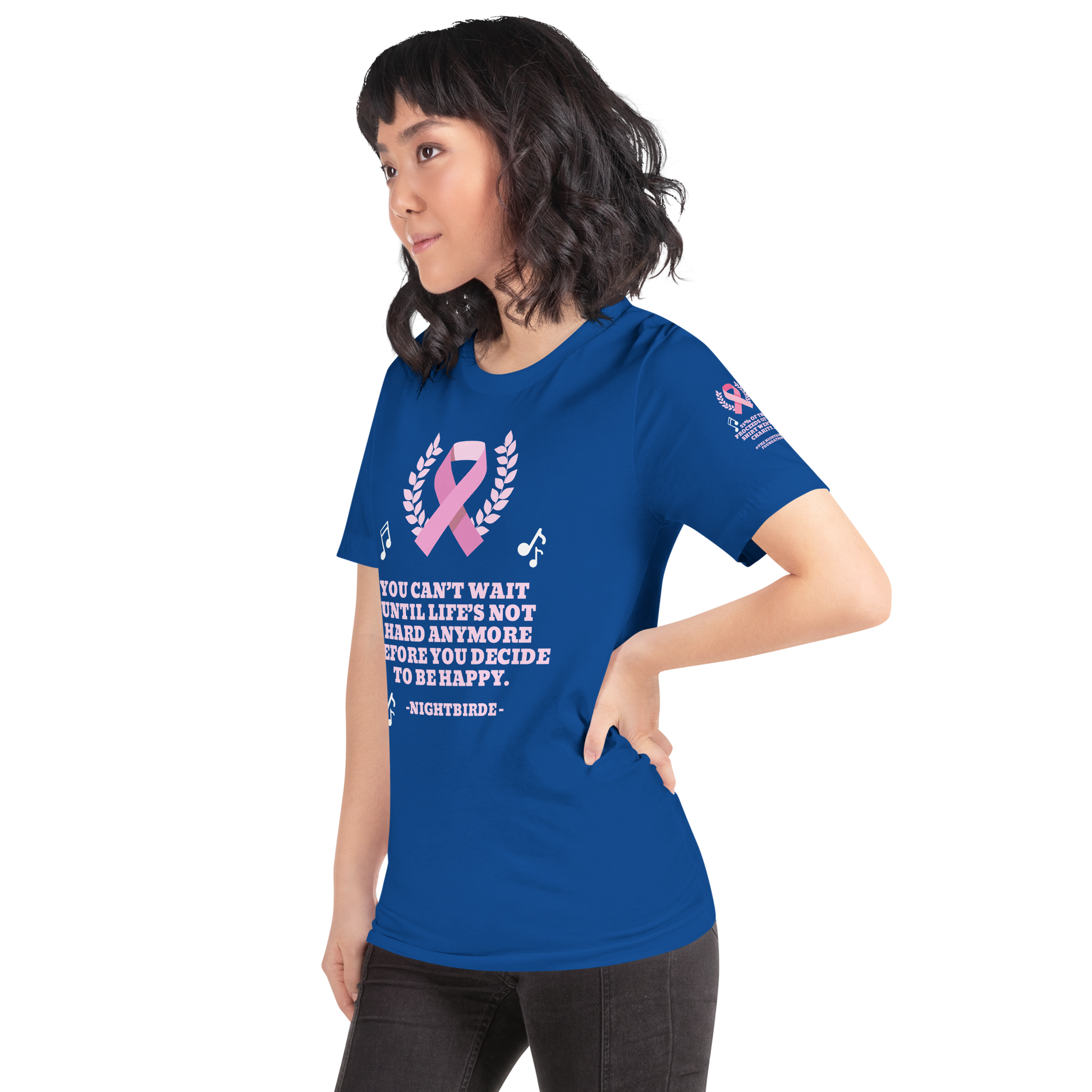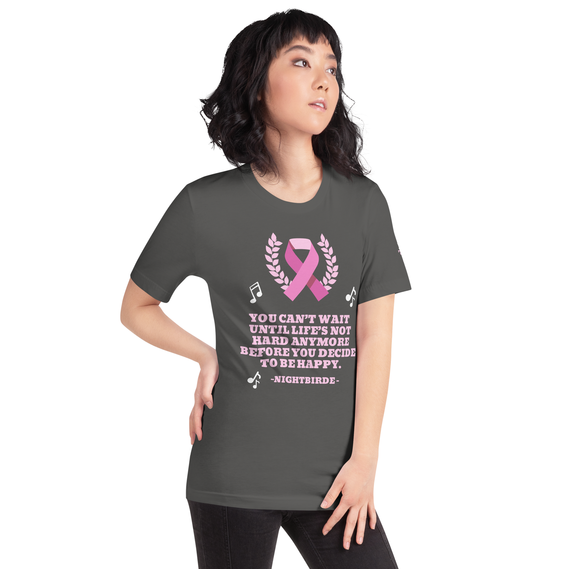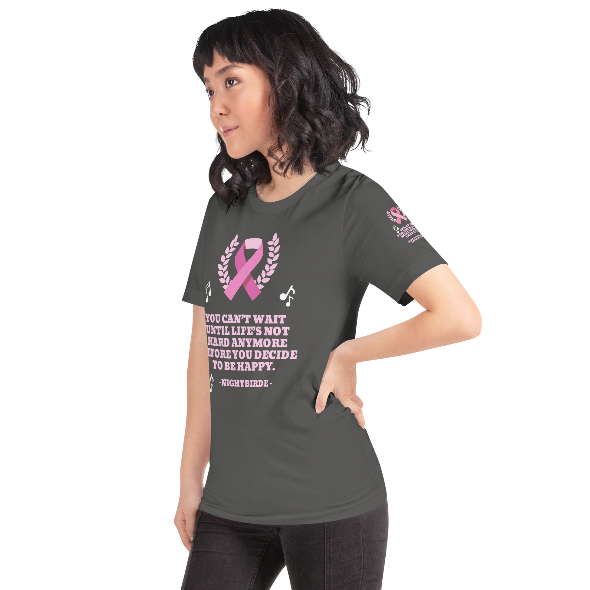 The breast cancer Nightbirde quote tee gives back to charity. 25% of the proceeds of this tee will be donated to The Nightbirde Foundation.