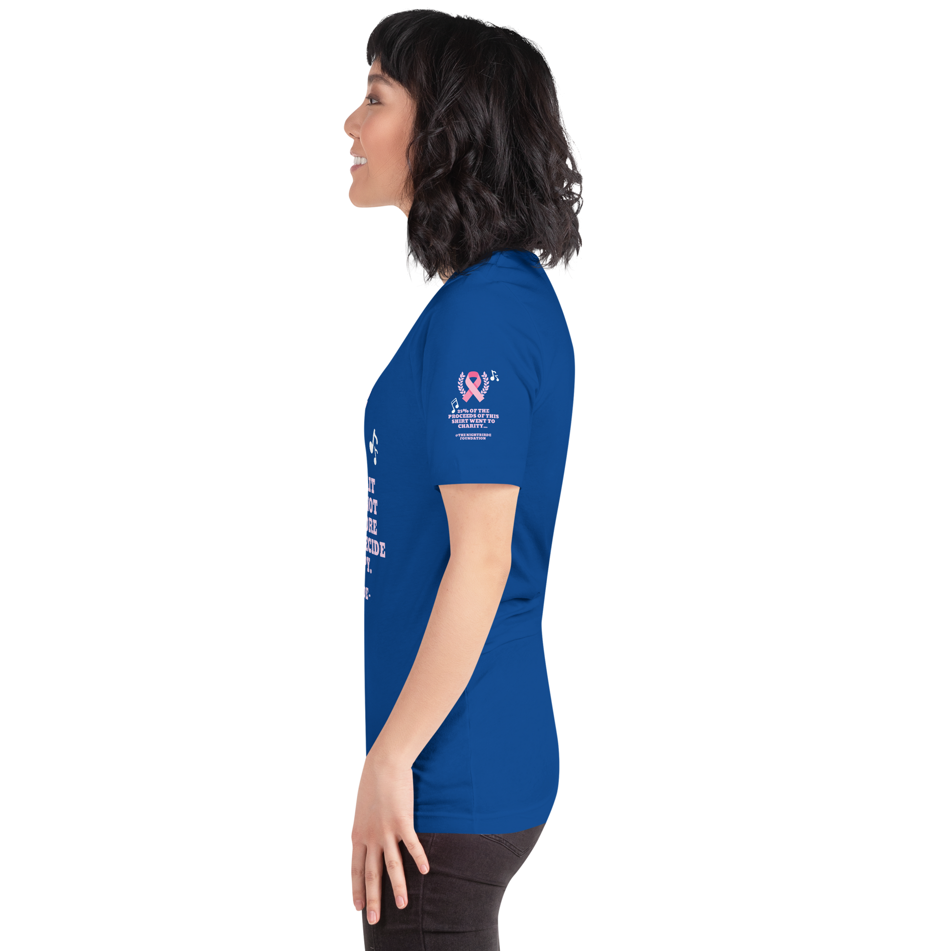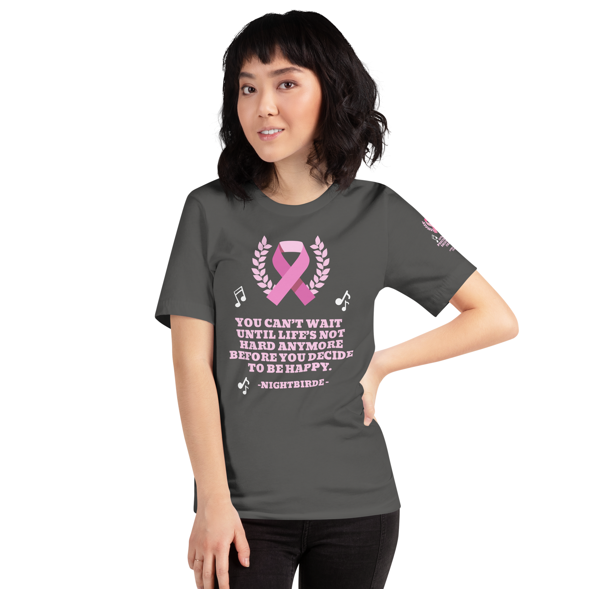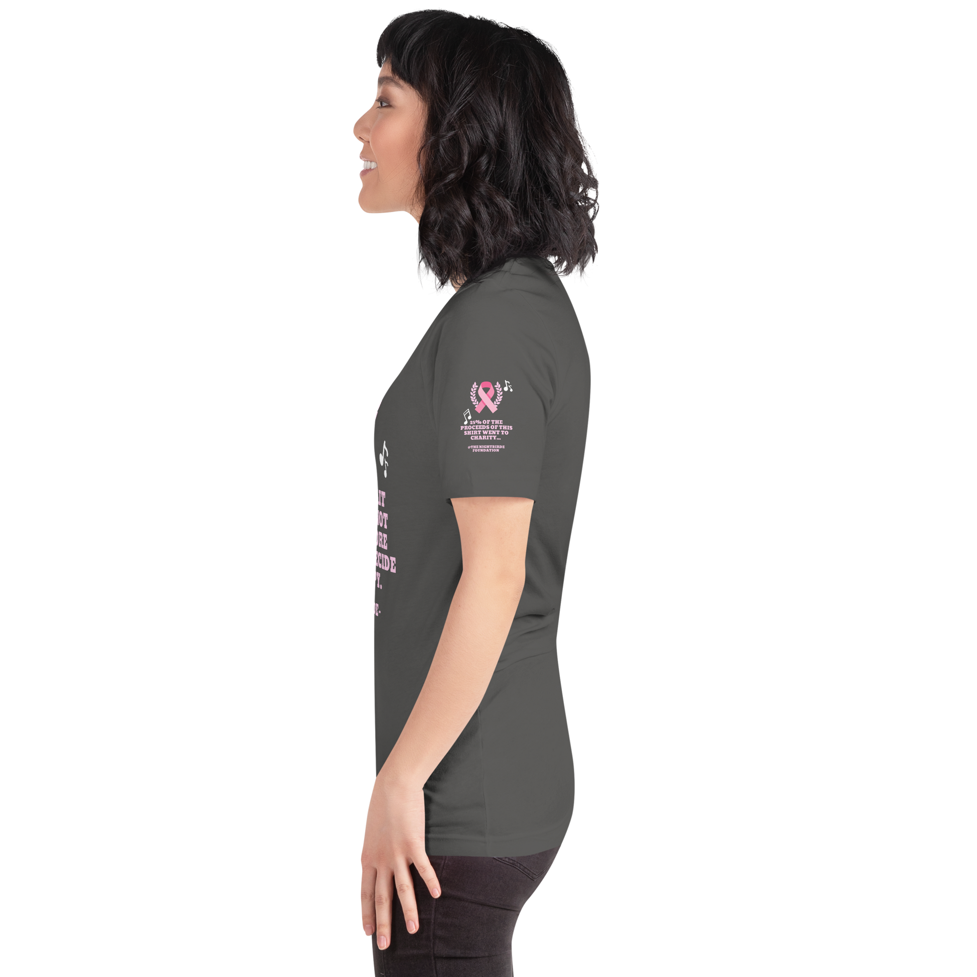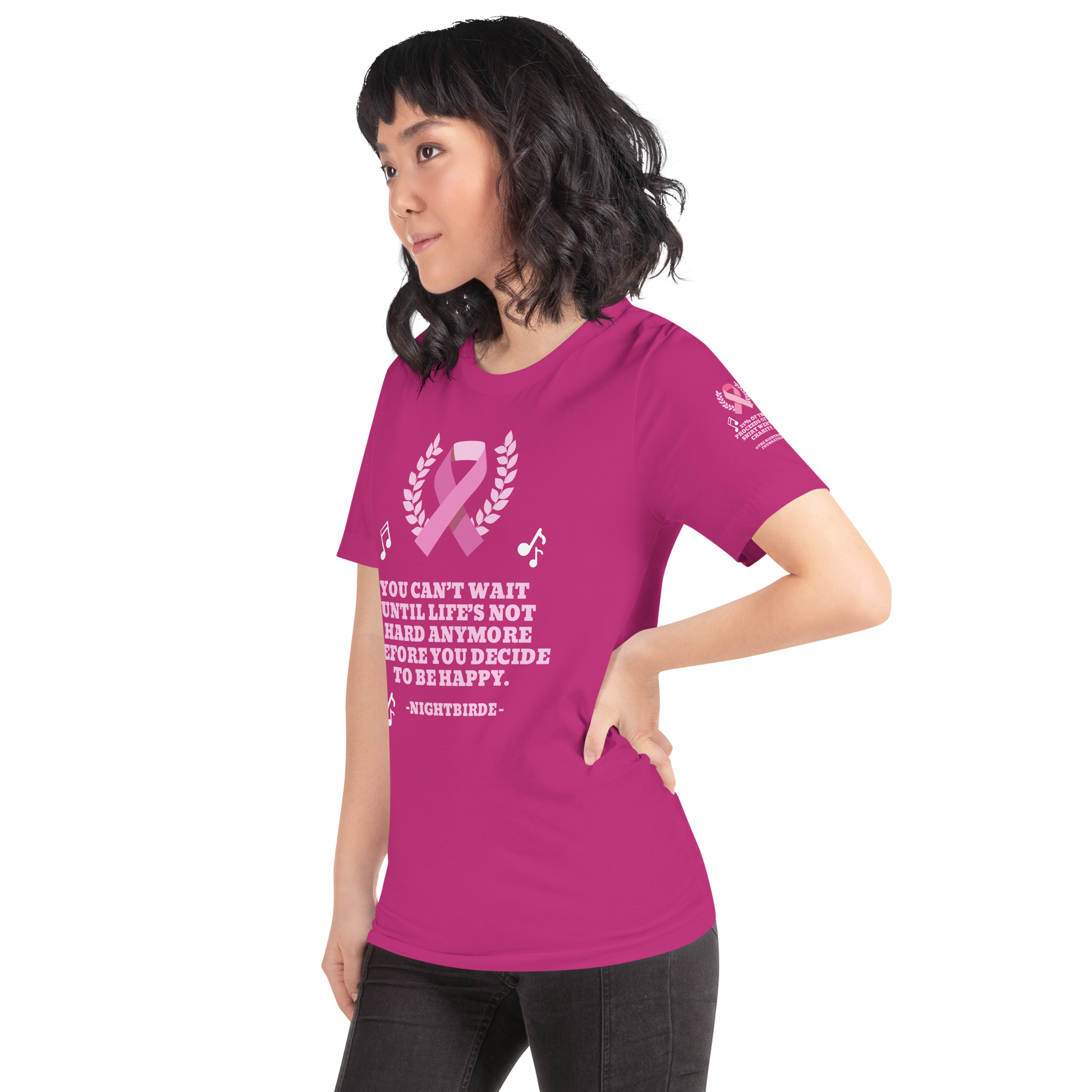 The breast cancer Nightbirde quote tee gives back to charity. 25% of the proceeds of this tee will be donated to The Nightbirde Foundation.