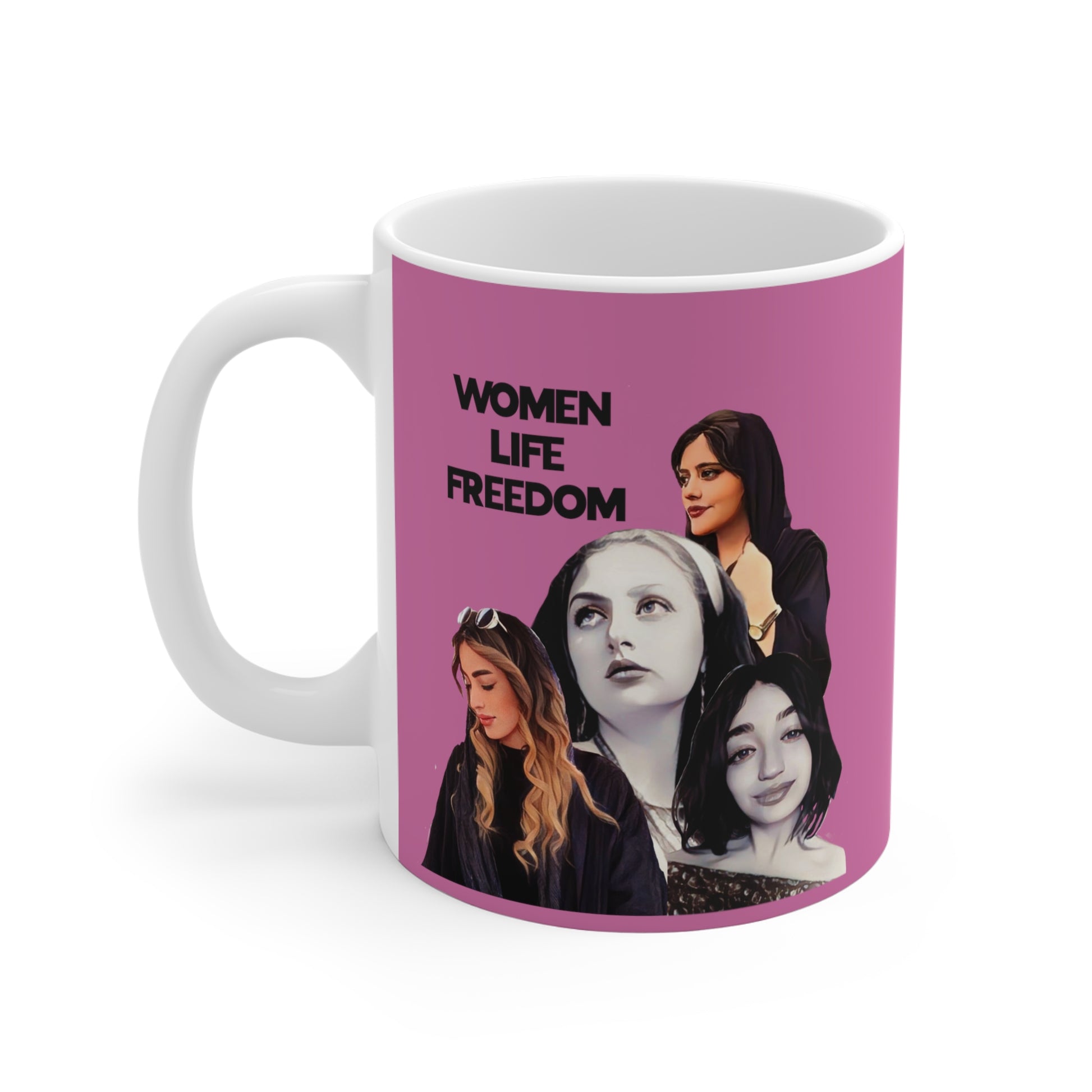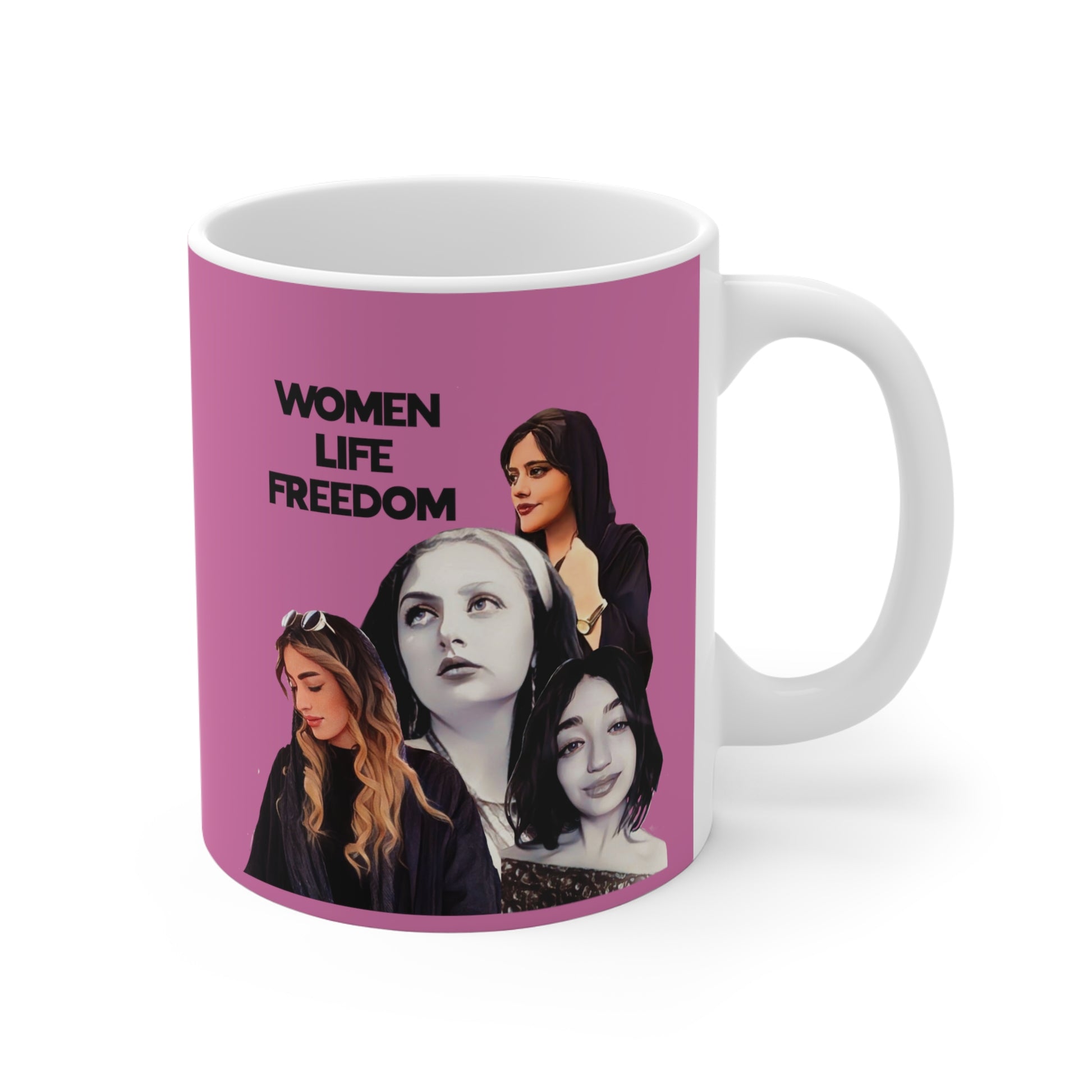 This beautiful Women Life Freedom fallen women of Iran gives back 25% of its proceeds to The NCRI Women's Committee. 11oz mug comes with a scratch-resistant finish and are ideal for any beverage. The easy-grip handle makes for a smooth drinking experience while the durable white ceramic body. The artwork contains the late Mahsa Amini, Sarina Elmailzadeh, Hadis Najafi and Dr. Aida Rostami.