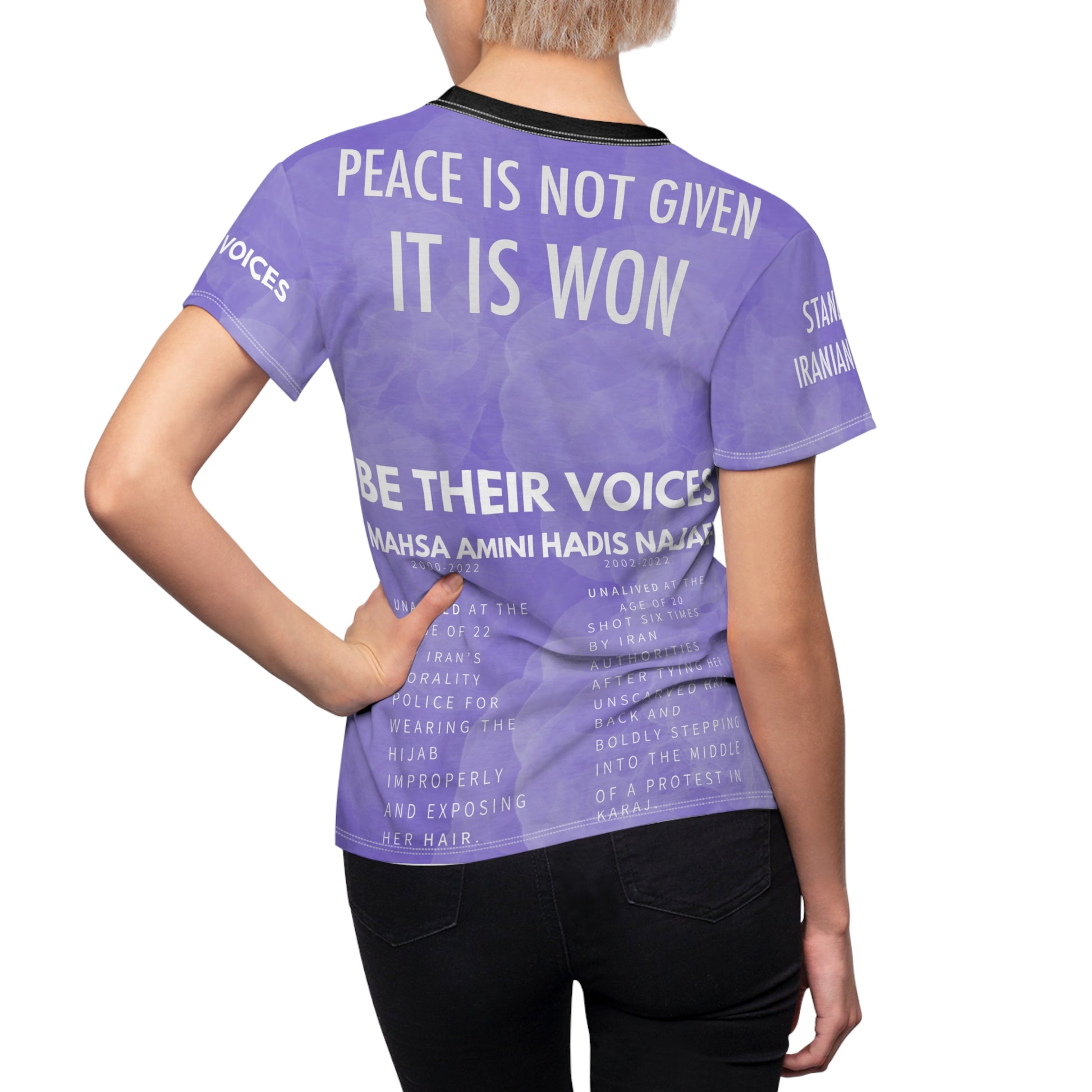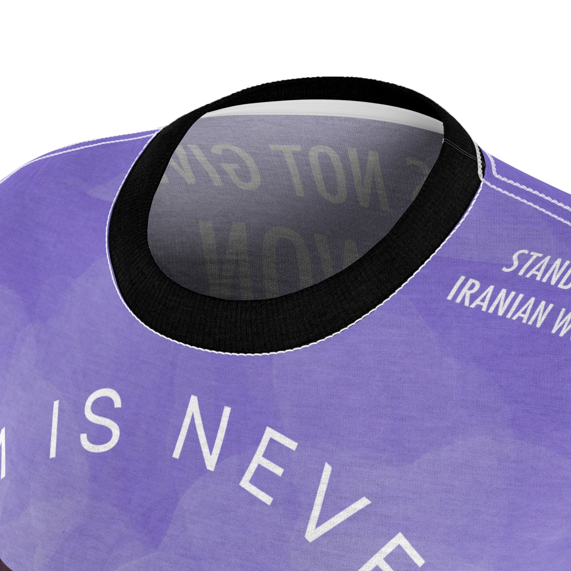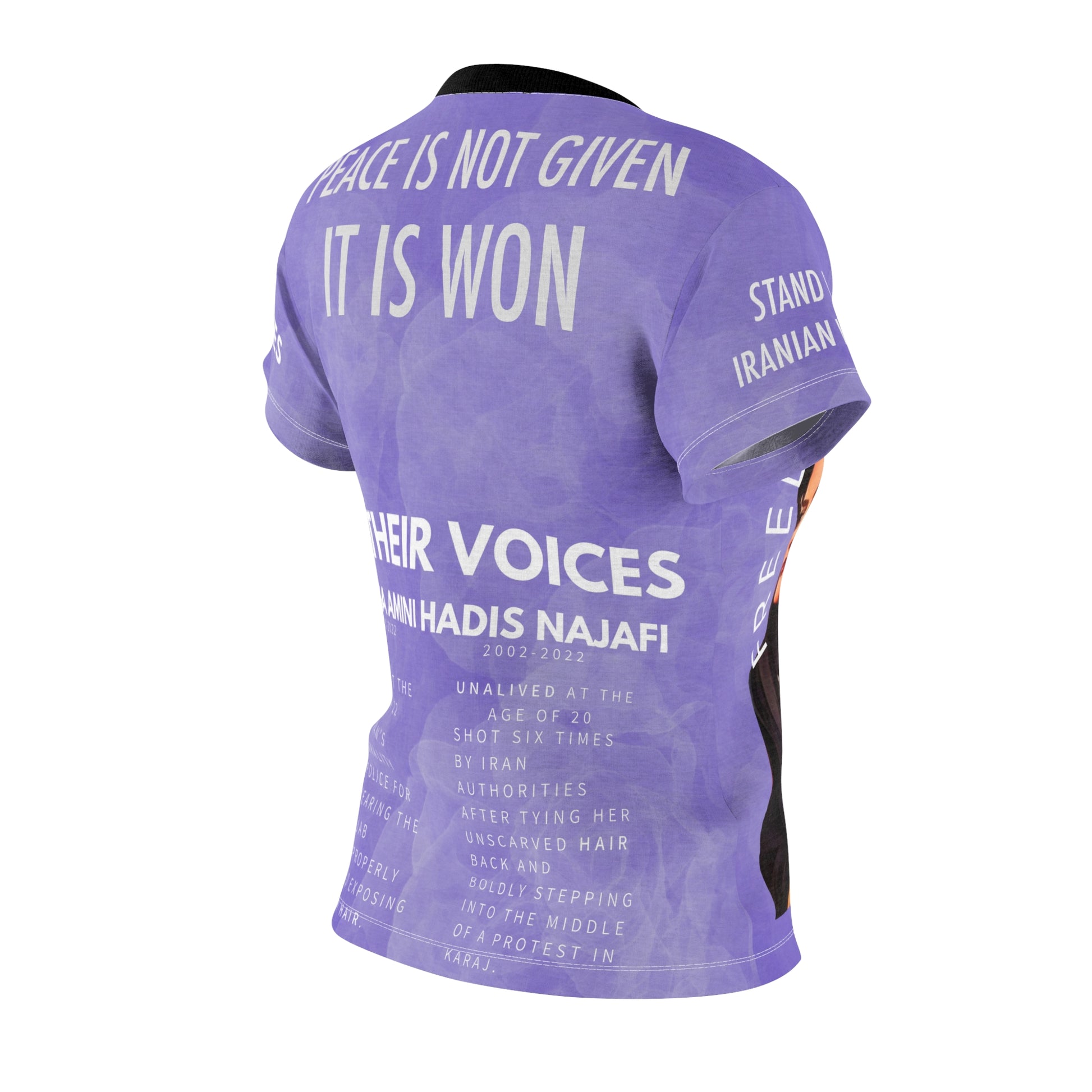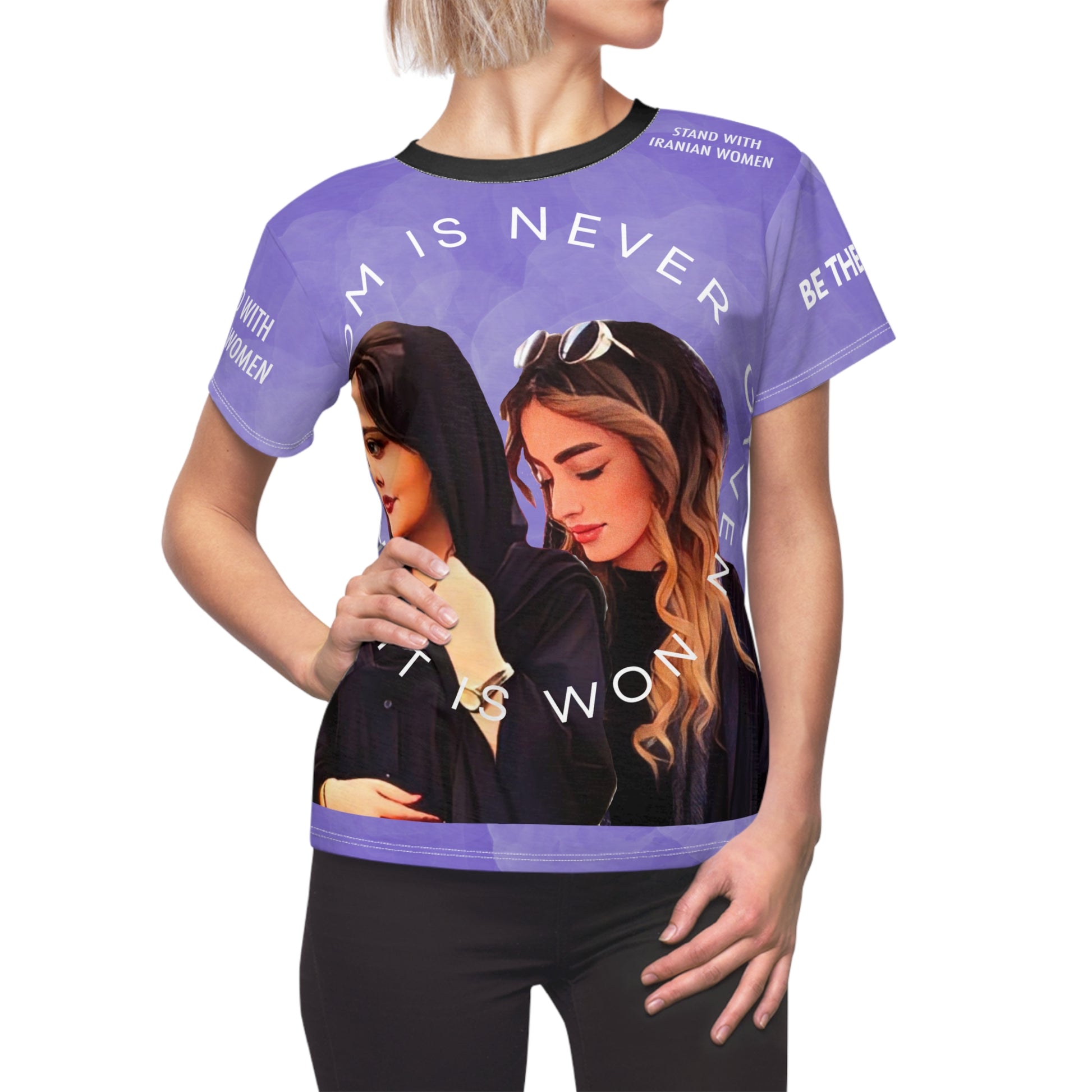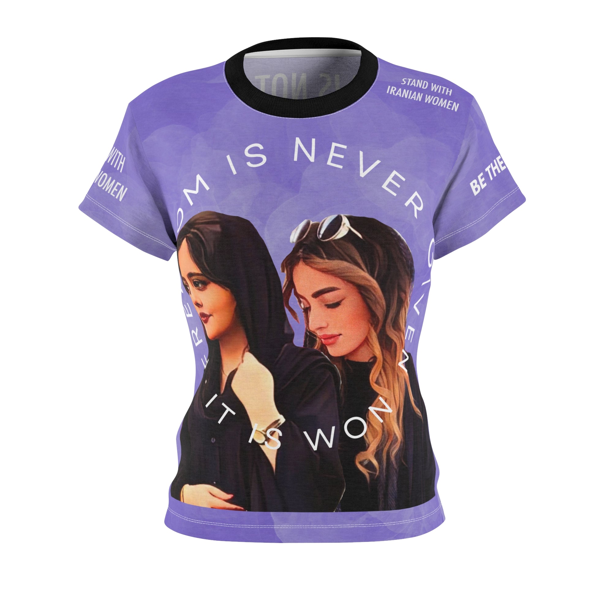 Classic and comfortable choice, this high quality AOP t-shirt is appealing from every angle. Inspired by the amazingly brave women of Iran.